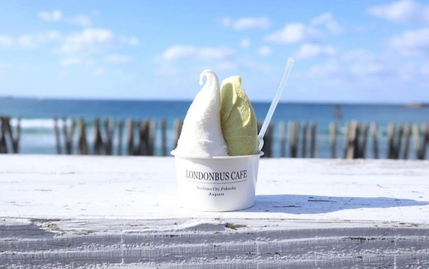 福岡県糸島市の志摩サンセットロード沿いで実際のロンドンバスがお店になっている本格ジェラートショップ。バスの2階がイートインスペースになっていて、糸島の美しい青い空と海とサンセットを眺めながら食べるジェラートが人気のお店です。
